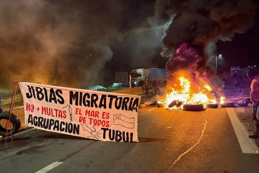 La mañana de este martes, pescadores artesanales se manifestaron por la extracción de jibia, bloqueando el acceso norte de la provincia de Arauco.