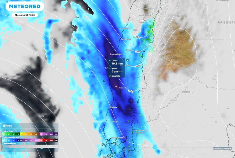 De acuerdo con Meteored, las precipitaciones más fuertes serán en la cordillera de la costa del Biobío, La Araucanía y Los Ríos durante el miércoles 30 y el jueves 31 de julio.