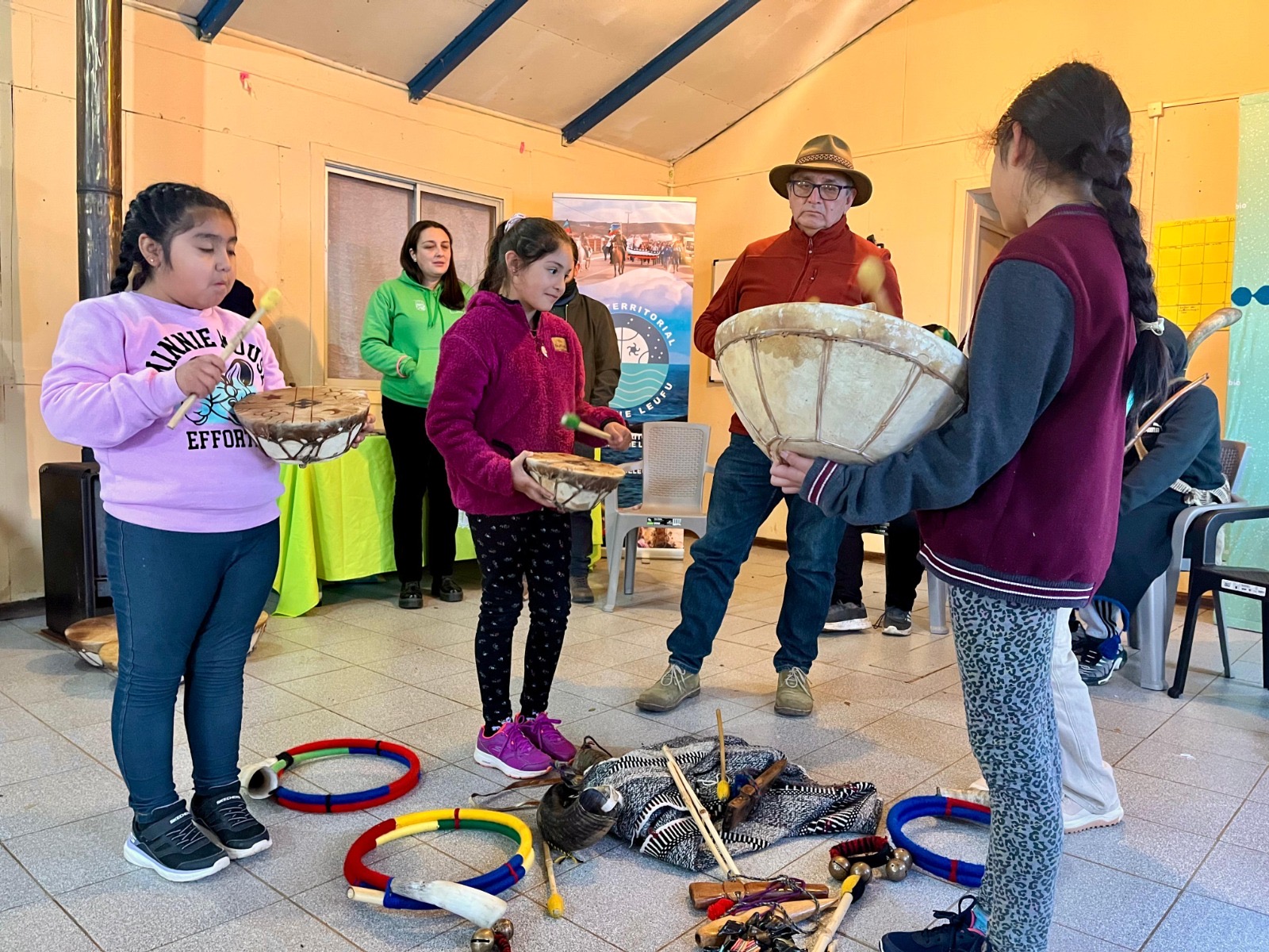 En las dependencias de la sede Villa El Bosque, y bajo la atenta mirada de los niños y niñas del barrio, el profesor Sergio Millacura entregó un taller en el que enseñó sobre la espiritualidad, la conexión con la tierra y tradiciones del pueblo indígena. Posteriormente, se invitó a los presentes a conocer y practicar con instrumentos musicales como el kultrún, trutruka y el trompe.